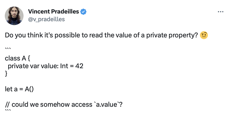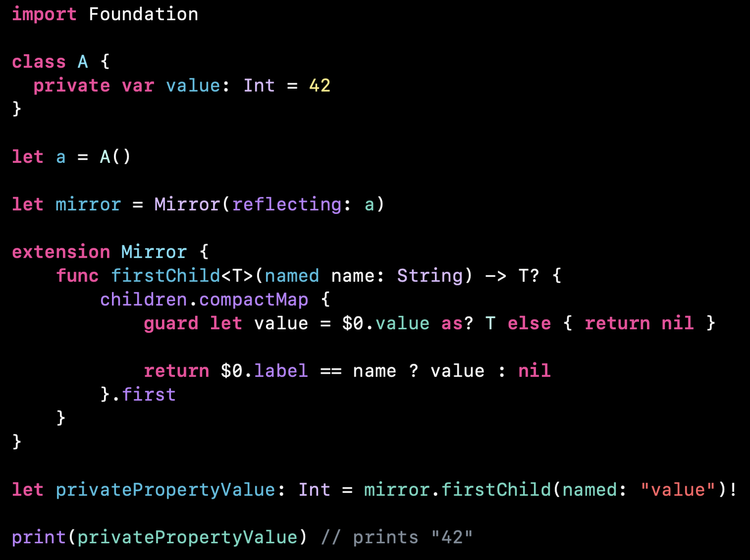 This counterintuitive result can be achieved through runtime introspection, using a special type called a Mirror.
