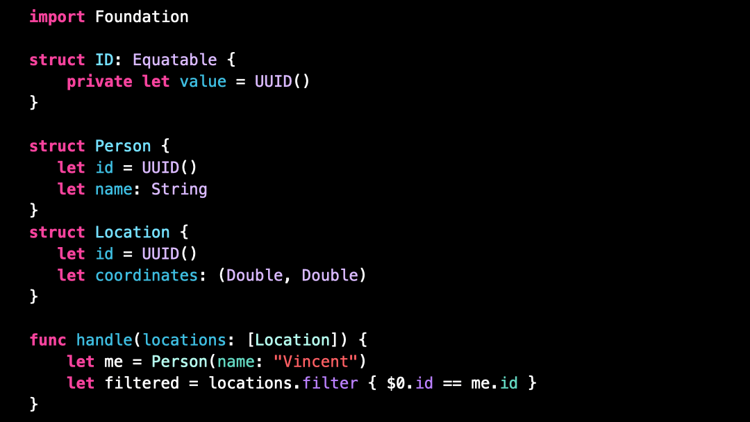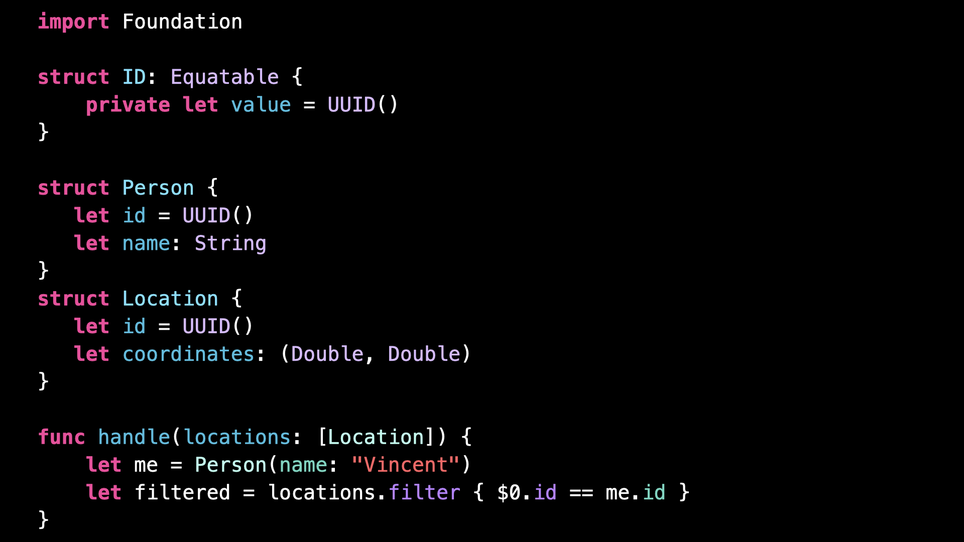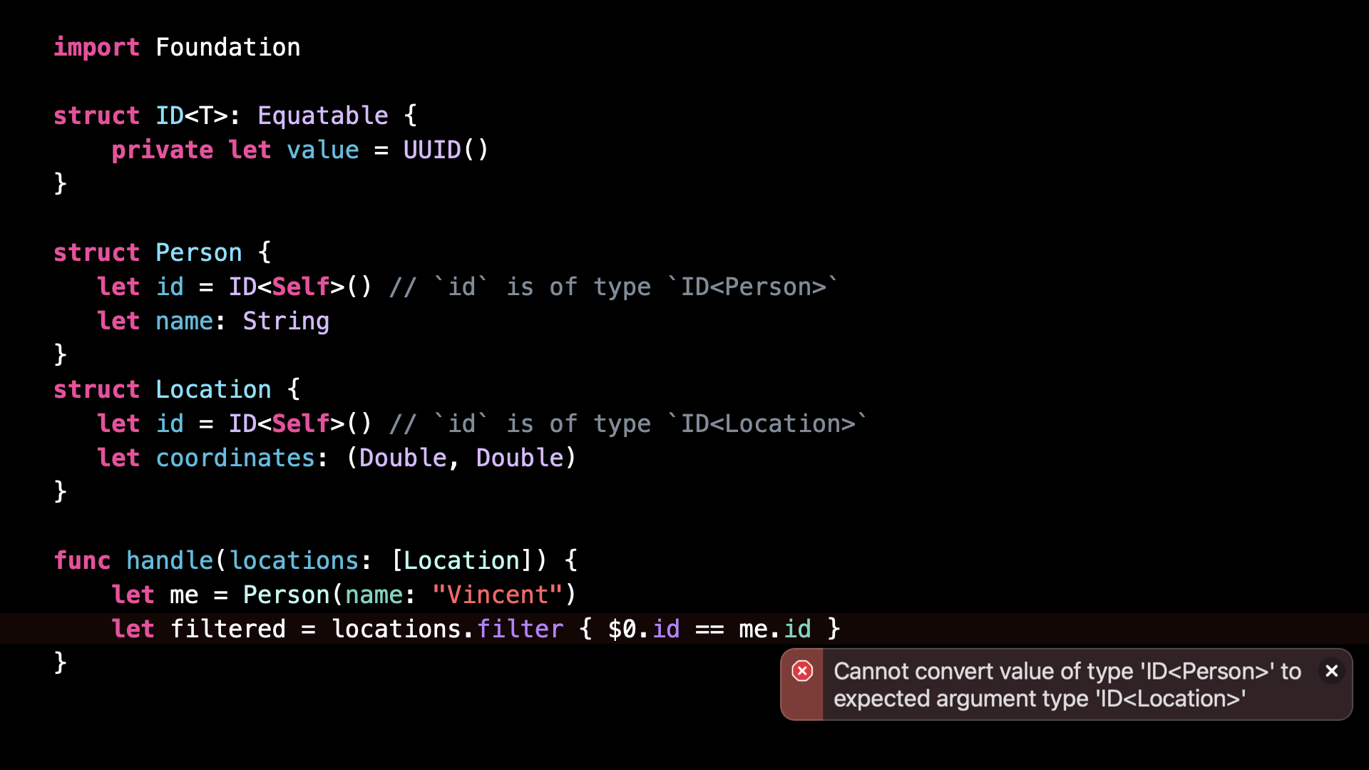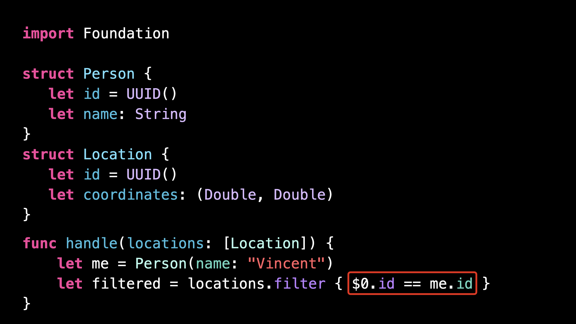 let filtered = locations.filter { $0.id == me.id } // compile-time error