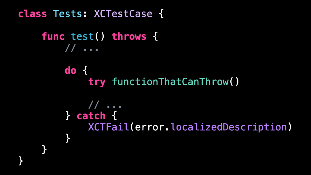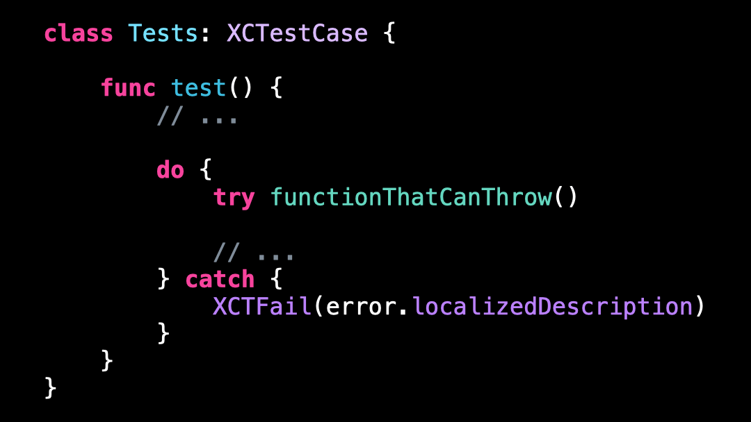 Thanks to this change, we no longer need to use a do and a catch statement to call our throwing function, which makes our testing code both easier to read and quicker to write.