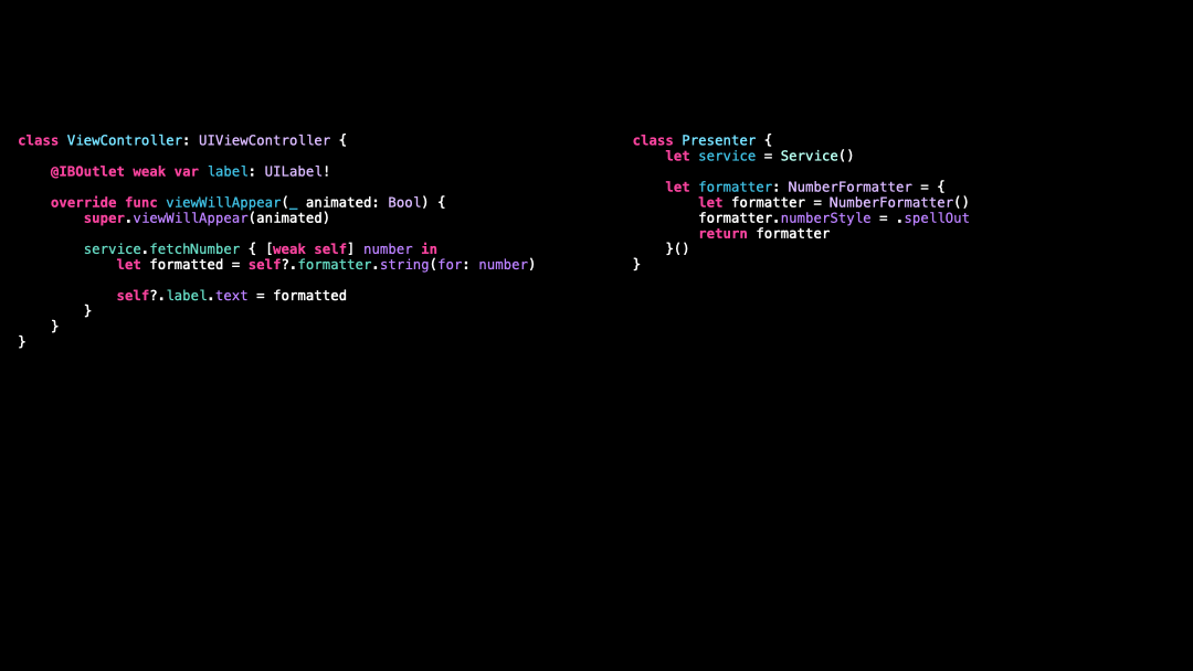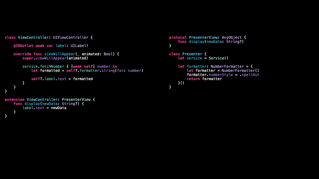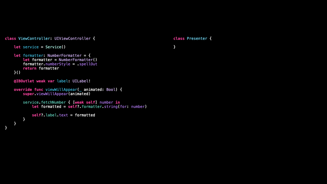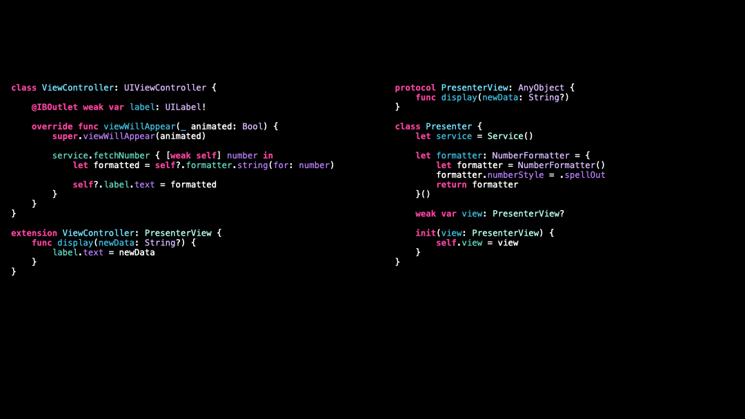 Now our ViewController can focus on its core responsibilities of setting up the UI and reacting to user interaction, while the Presenter takes care of retrieving, formatting and presenting the data 👌