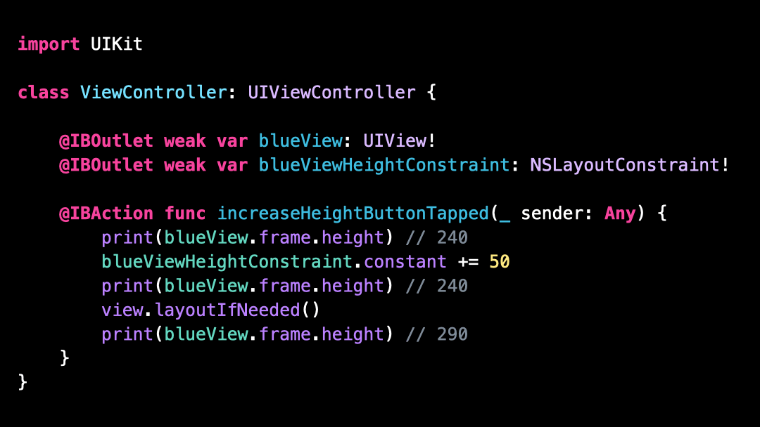 And as you can see, after calling the method .layoutIfNeeded(), the height of the blueView has indeed been updated.