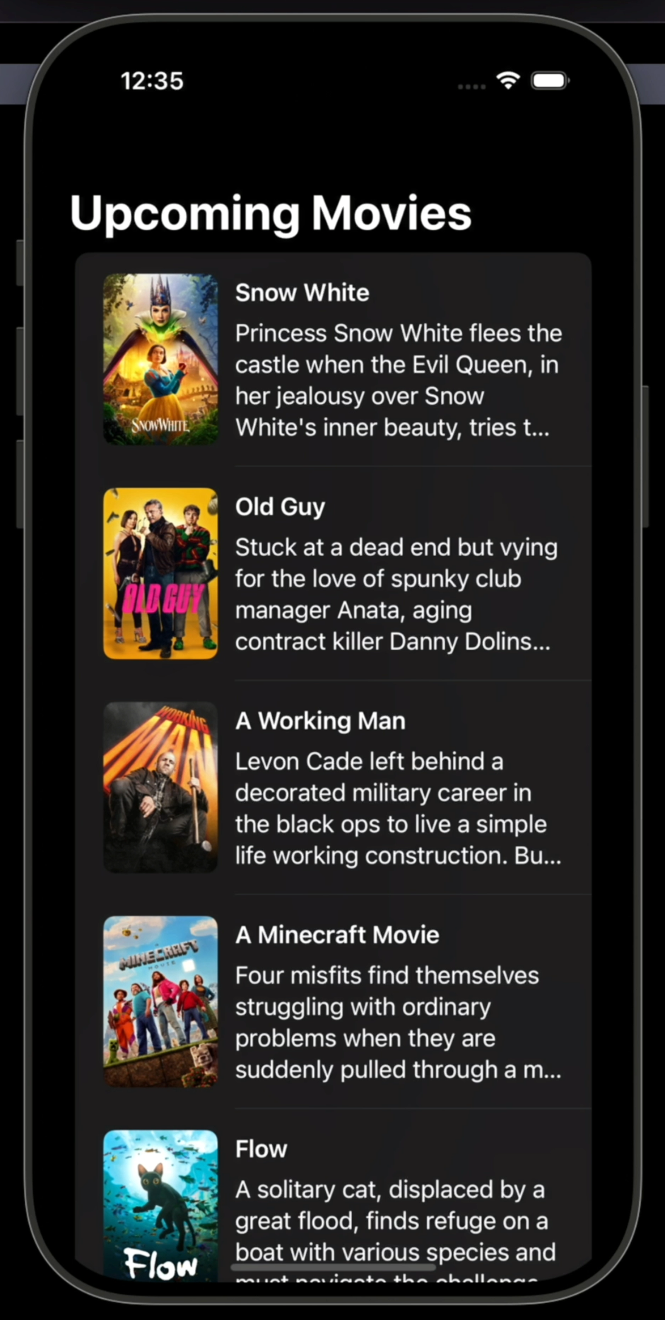 As you can see, I've implemented a simple SwiftUI app that queries an API to fetch and display a list of upcoming movies: