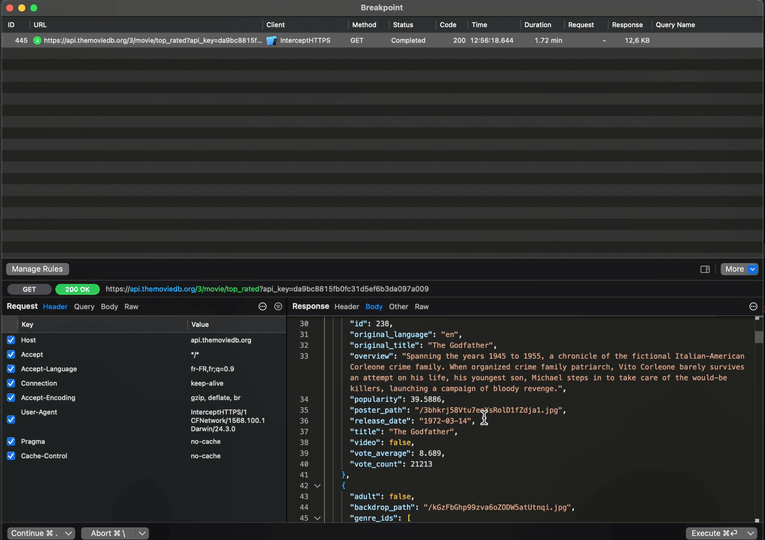 Finally, when the execution resumes, we can see that the data our app has received is indeed the one the we’ve modified: