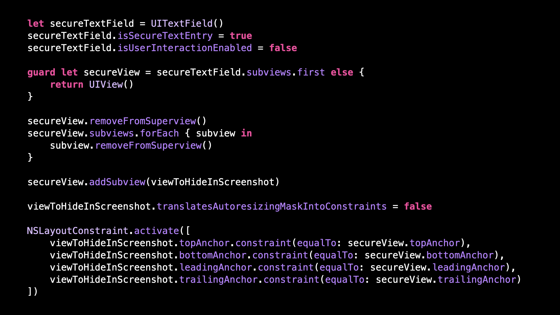 And finally, we simply add the view that we want to hide in screenshots as a subview: