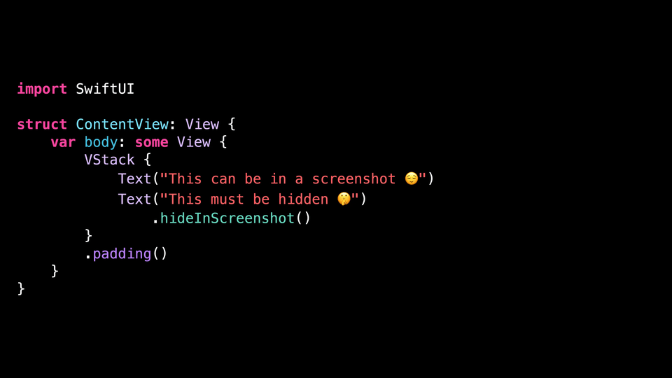 func hideInScreenshot(_ shouldHide: Bool = true) -> some View {
