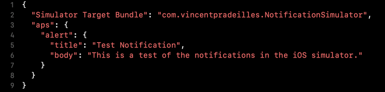 As you can see, this file contains the typical payload of a push notification, along with the bundle identifier of the app that will receive the notification.