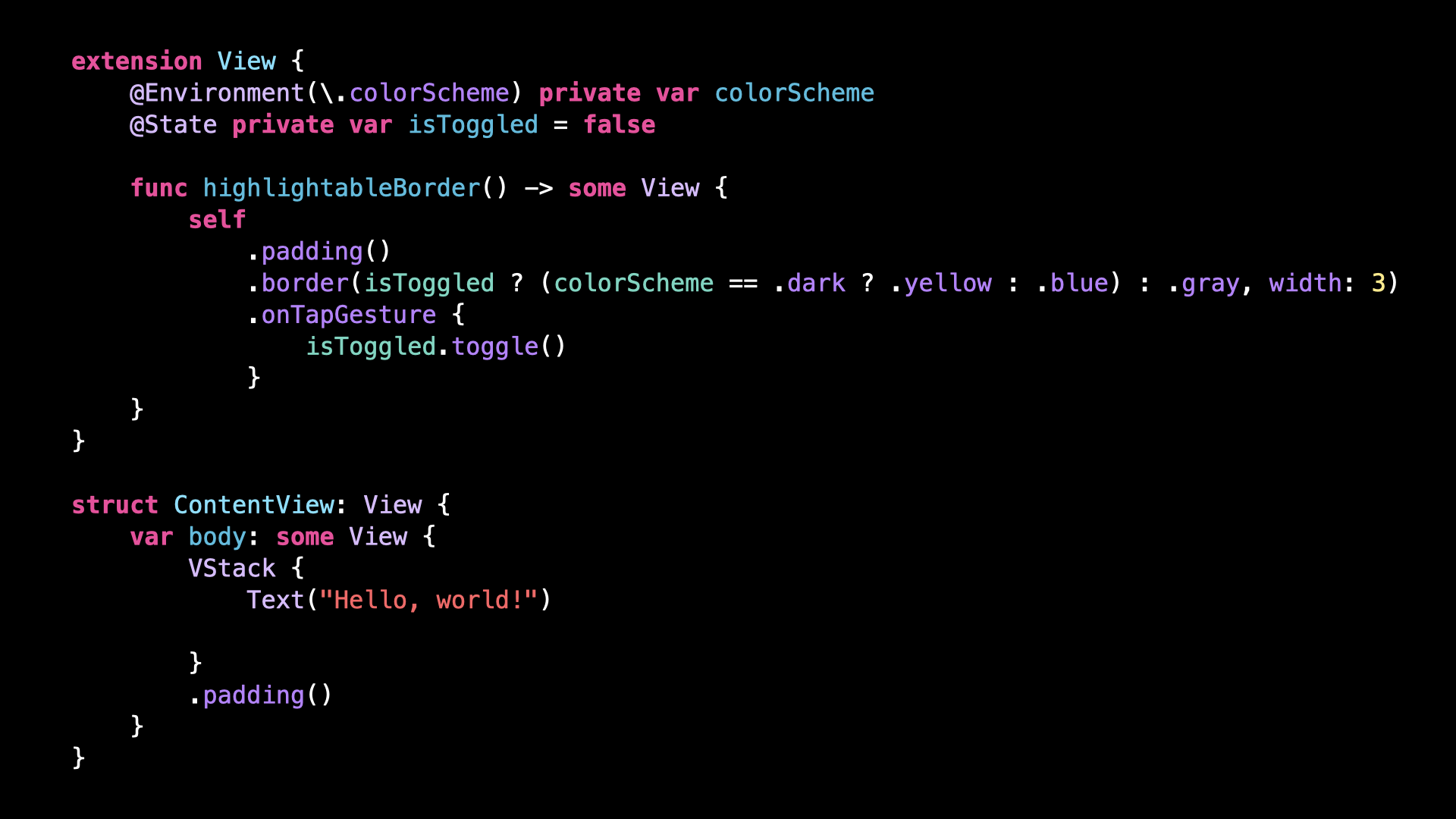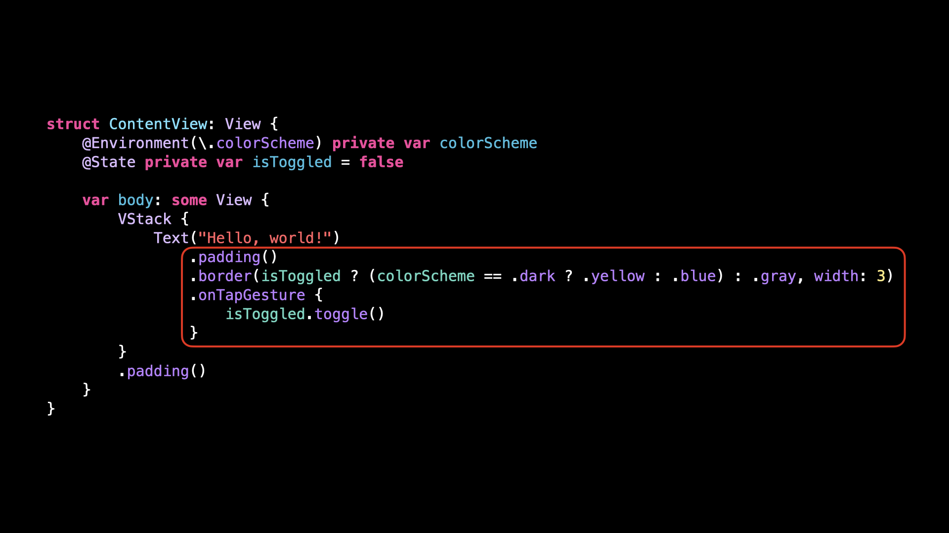 .border(isToggled ? (colorScheme == .dark ? .yellow : .blue) : .gray, width: 3)