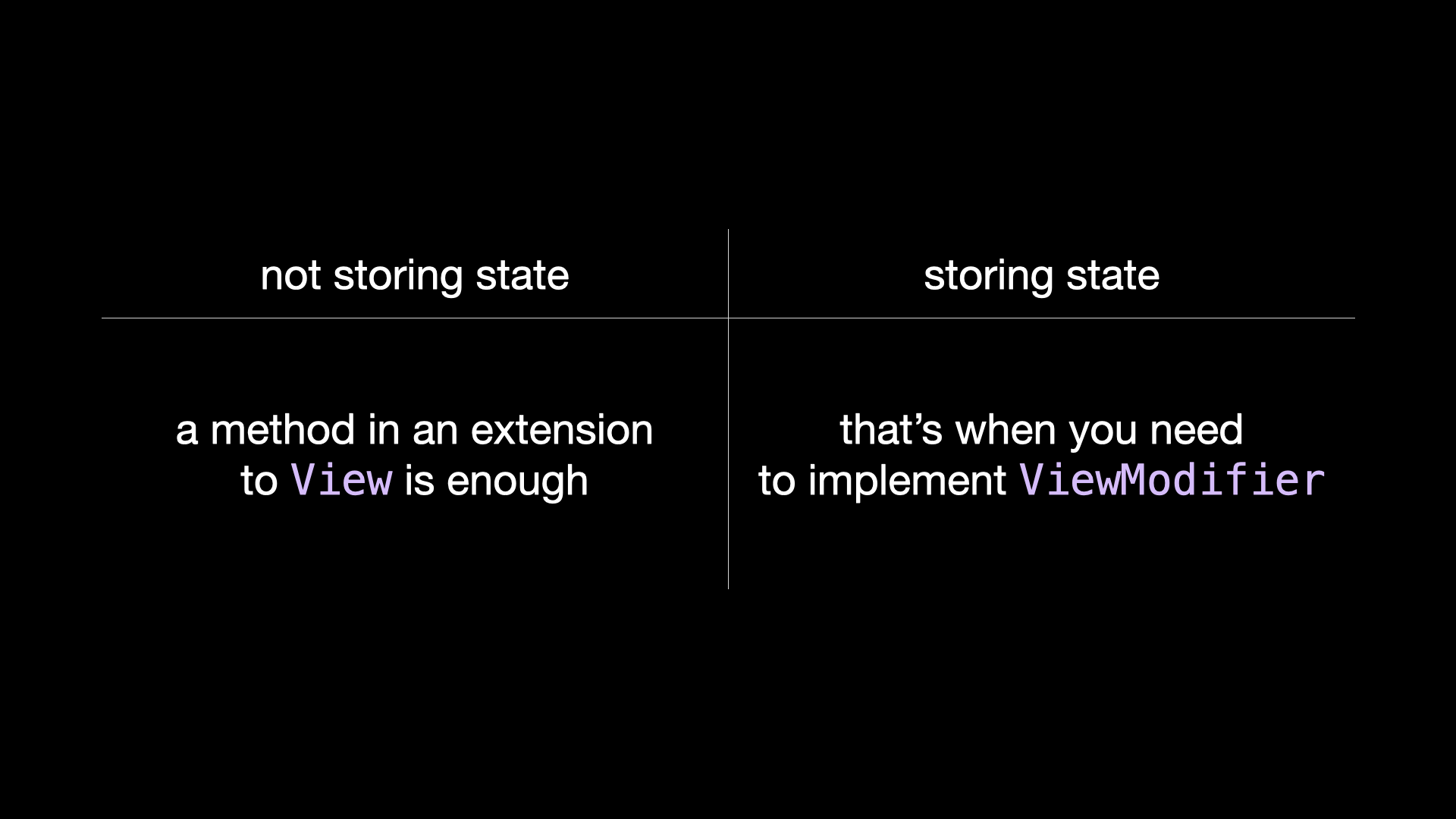 However, if you also need to encapsulate state or use property wrappers, then you’ll indeed have to also create a ViewModifier