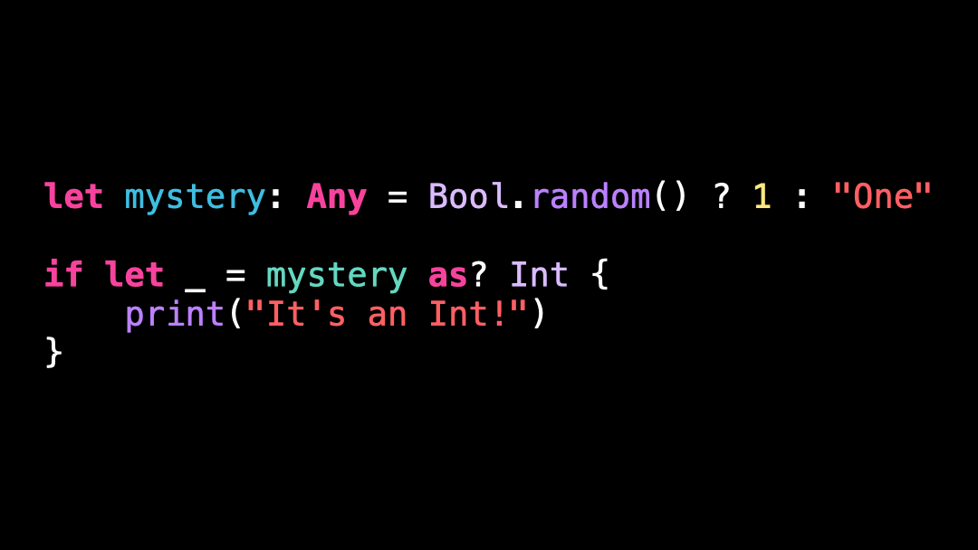 let mystery: Any = Bool.random() ? 1 : "One"