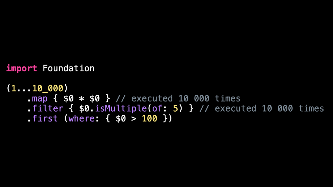 .filter { $0.isMultiple(of: 5) } // executed 15 times